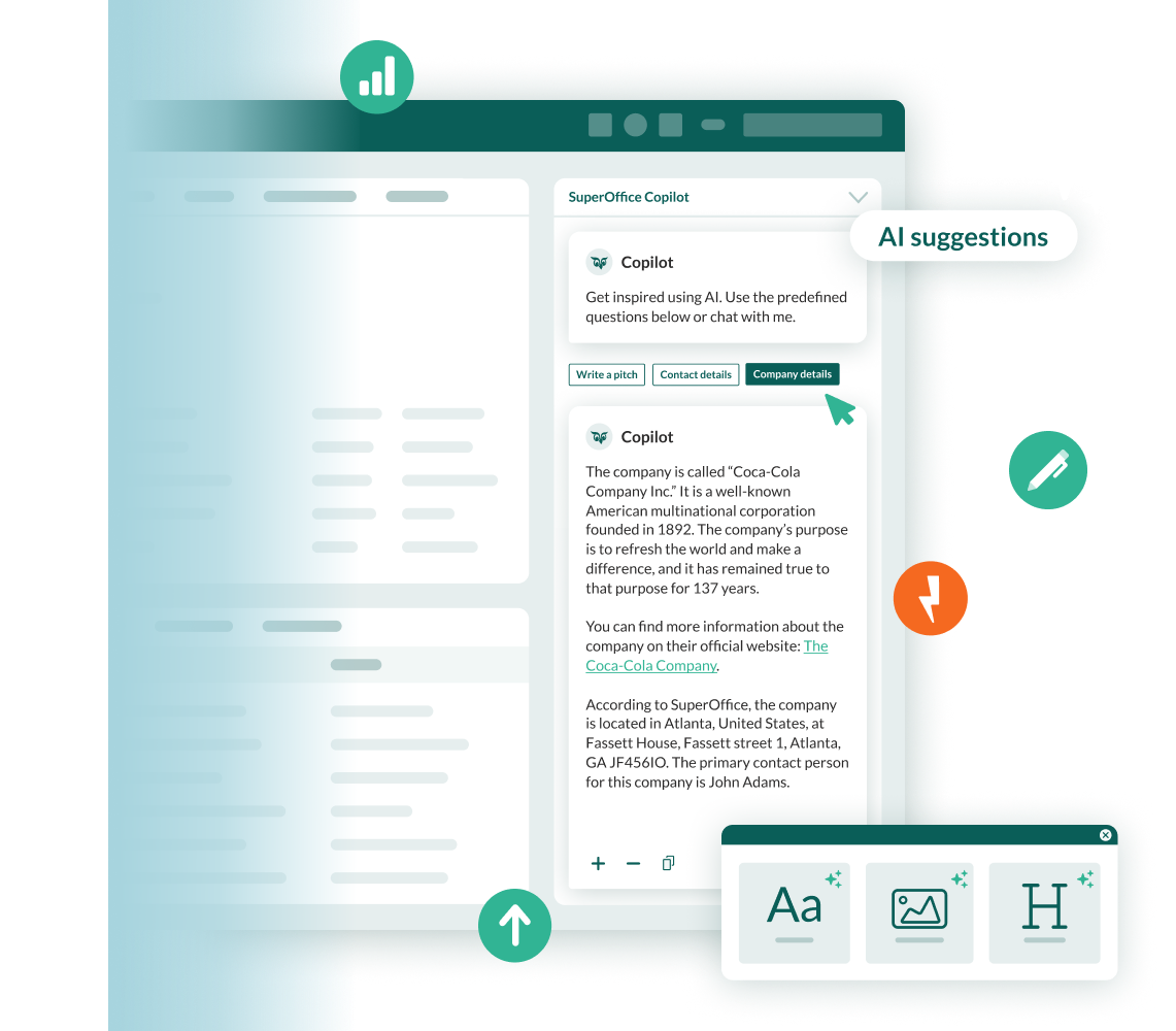 Get instant summaries of ticket requests and your calendar. Access insights across your entire CRM in seconds. Generate personalized proposals, pitches, and custom campaign images. Empowering your entire organization to build better relationships has never been easier – now with the help of AI on your SuperOffice CRM.